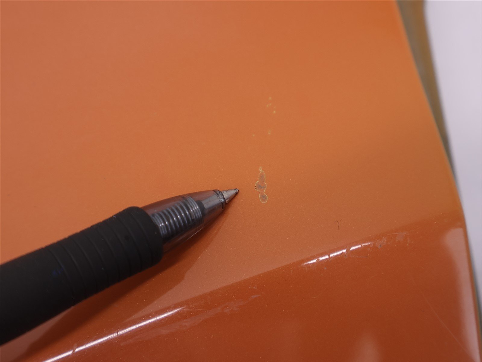 Has a small scratch on the front and some wear on the edge as shown in pictures